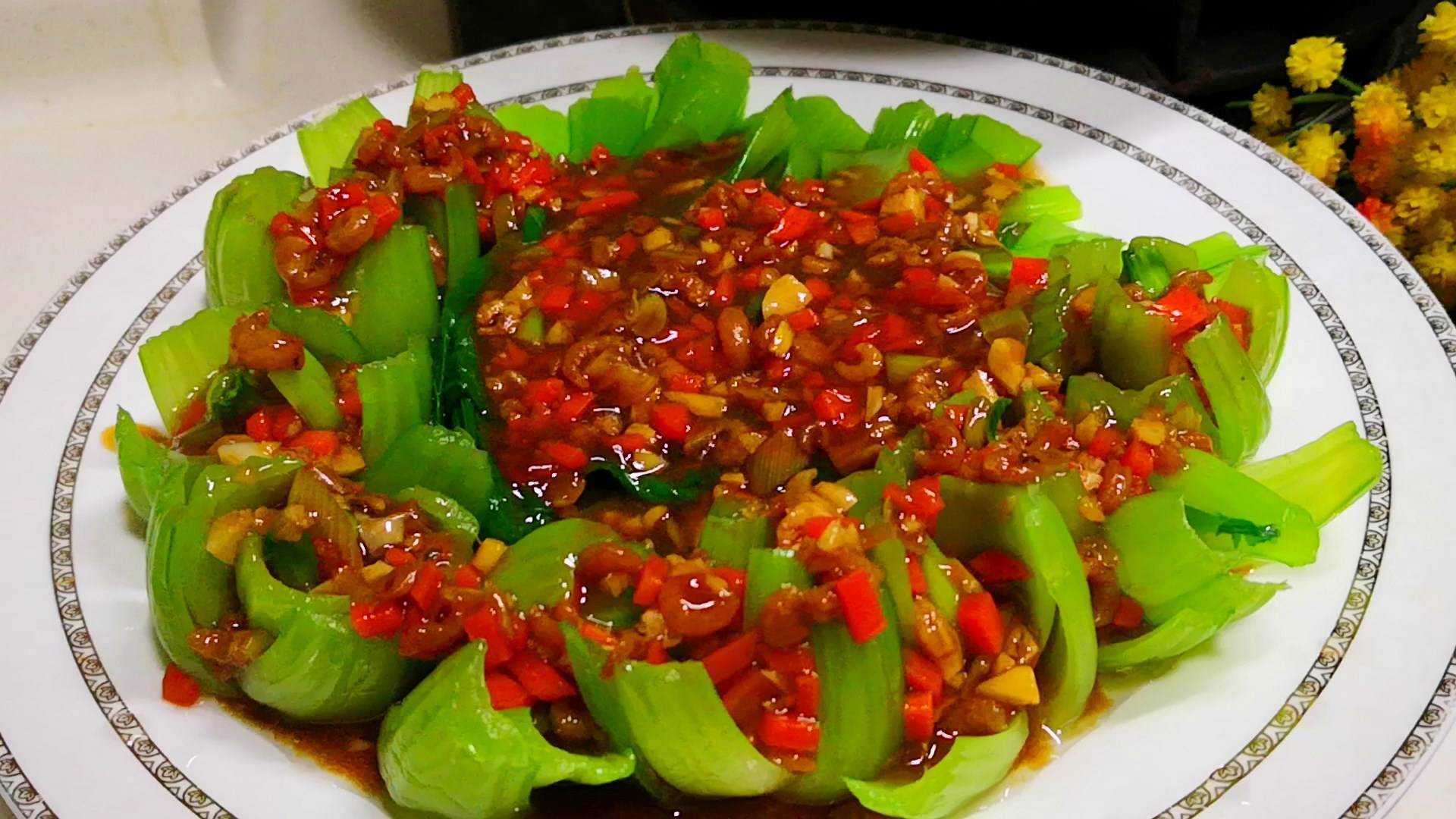 5.再将汤汁淋到油菜上,吃的时候用筷子拌拌即可。