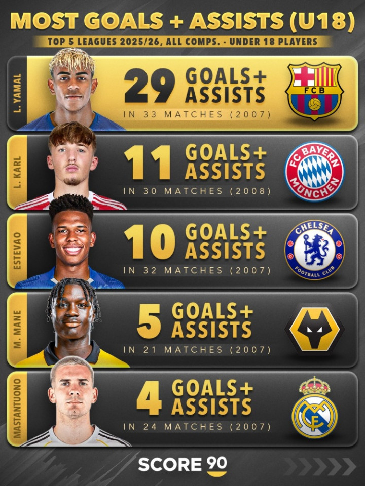 直播吧2月24日讯巴萨小将亚马尔已是球队重要一员,他在进攻端给球队带来了巨大的帮助。根据score90的数据统计,亚马尔是本赛季五大联赛各项赛事参与进球最多的U18球员,他在33场比赛中参与了惊人的29球。